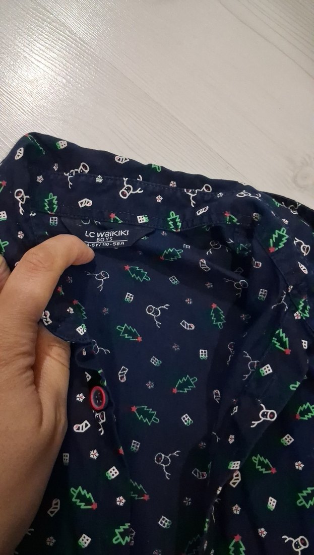 Dar kesim, uzun kollu, V yaka ve düğmeli erkek çocuk gömleği. Koyu renkli sentetik kumaş, çok renkli baskılı desenle trendy sokak stili için uygun.