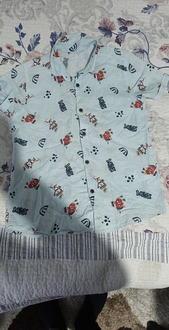Erkek çocuk için pamuklu, çok renkli baskılı, kısa kollu, yakalı ve düğmeli, bol kesim gömlek.