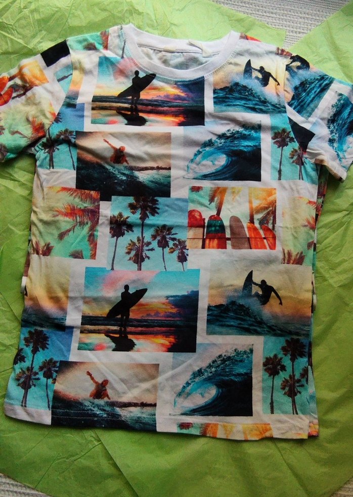 Erkek çocuk için çok renkli baskılı tişört, kısa kollu ve yuvarlak yakalıdır. Pop kültür temalı sörf ve plaj baskıları, yumuşak tekstil kumaş üzerindedir. 8/10 YAS UC ADET