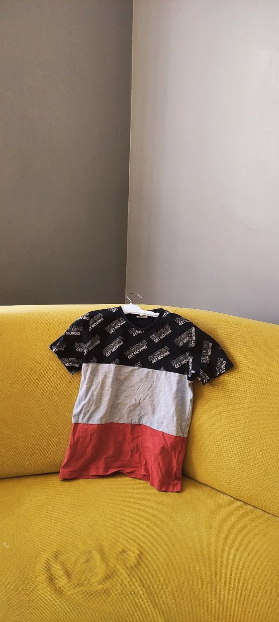 Erkek çocuklar için kısa kollu, bol kesim ve yuvarlak yaka tişört pamuk kumaş, çok renkli blok desenli ve baskılı, Velcro detaylı. Trendy sokak stili için uygun.