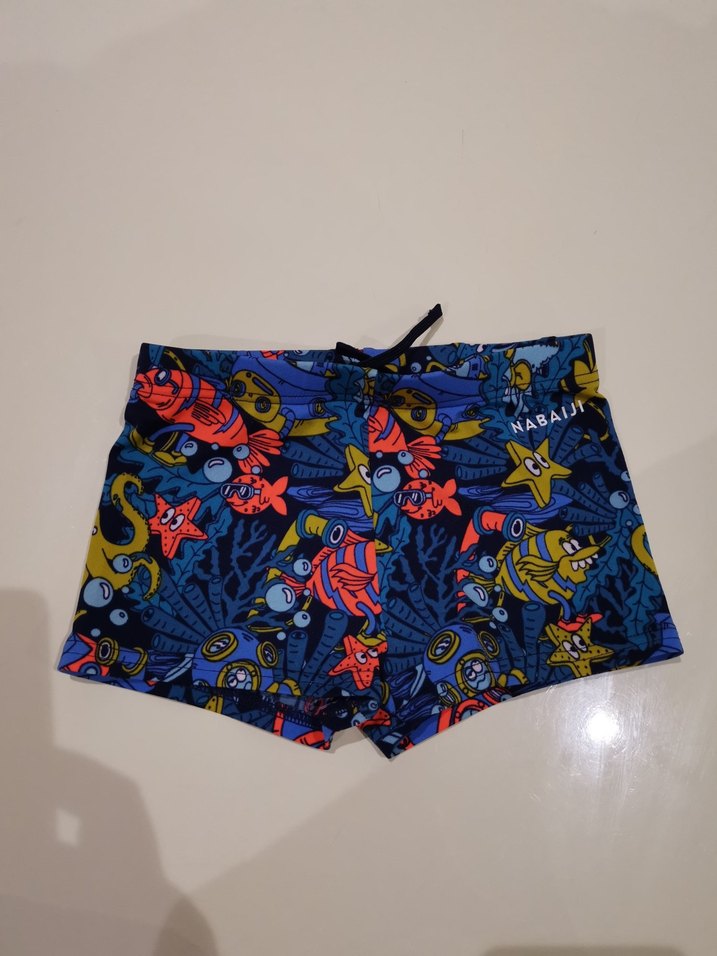 Erkek çocuk mayo, mavi zemin üzerinde renkli deniz canlıları deseni ve bağcıklı bel ile rahat bir kullanım sunar.