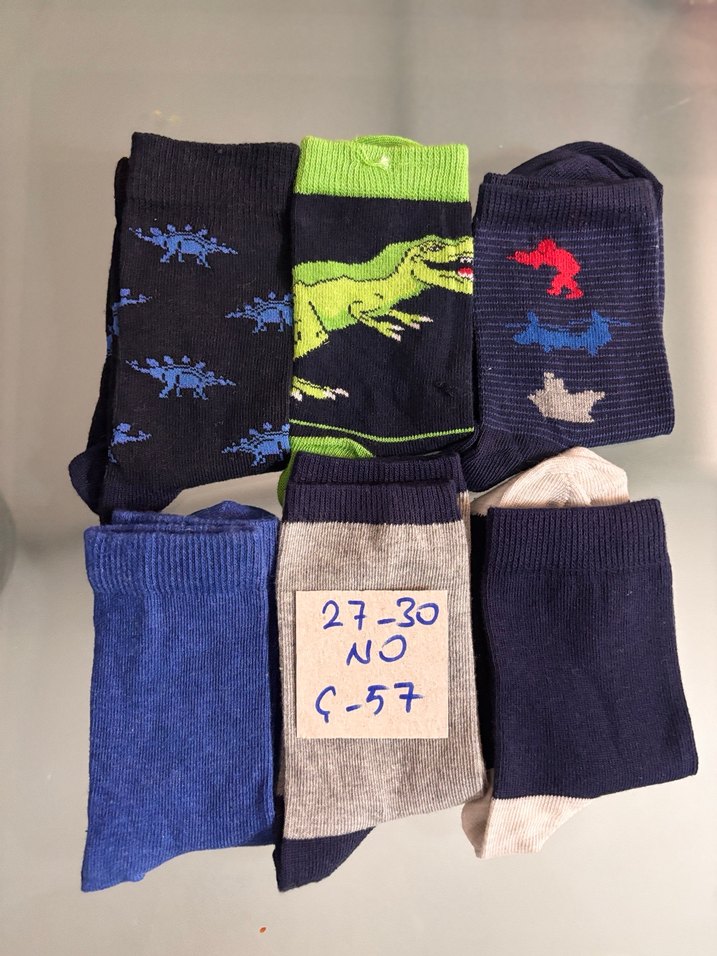 27-30 numara, çok renkli ve desenli erkek çocuk çorap seti. Dinozor ve gemi desenleri bulunur.