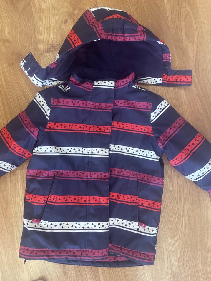 Erkek çocuk için çok renkli baskılı desenli, kapüşonlu ve çıtçıtlı, yumuşak ve sıcak iç yüzeyli dar kesim kaban.98-104 cm