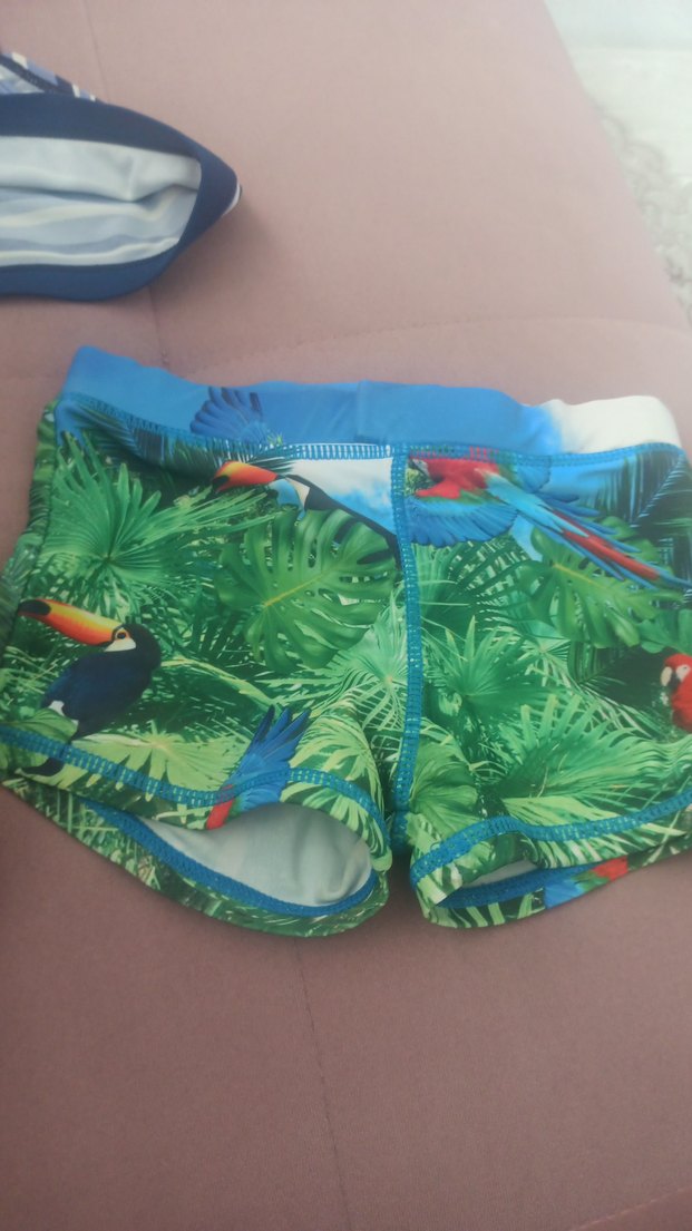 Çok renkli, tropikal desenli erkek çocuk mayo şortu. Canlı renkler ve doğa temalı desenlerle tasarlanmıştır. lastik bozulmuş