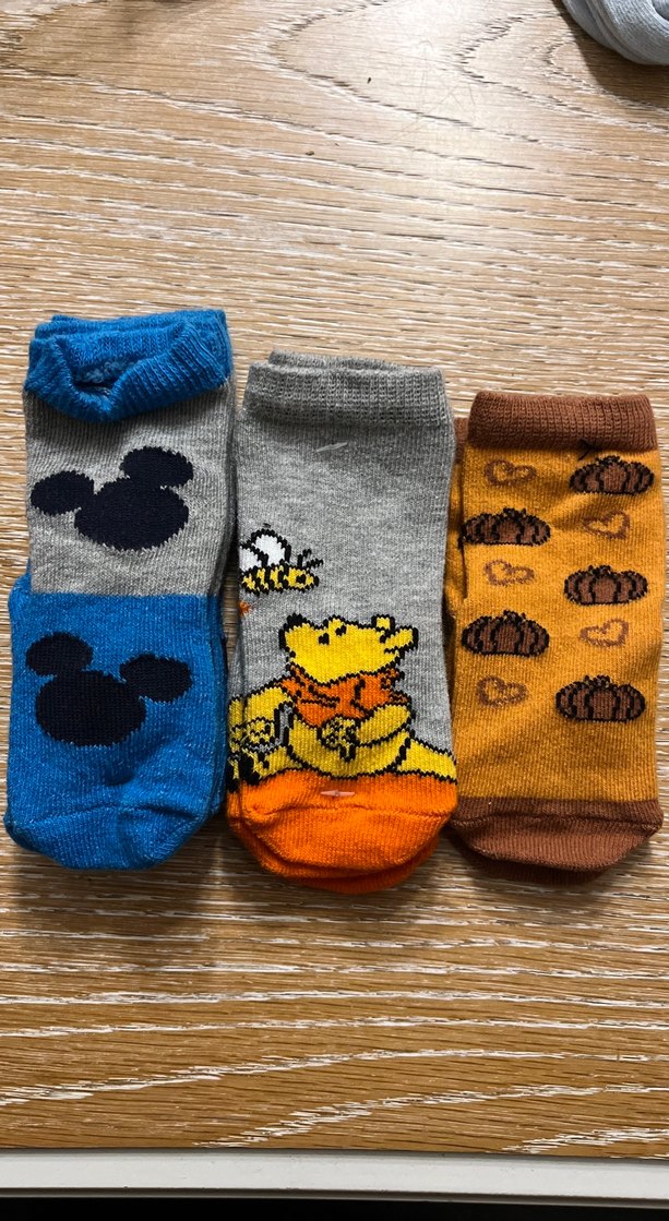 Çok renkli nakışlı desenlere sahip, gri, mavi ve turuncu tonlarında üç çift erkek çocuk çorabı seti. Her çorap eğlenceli figürler ve desenler içerir.