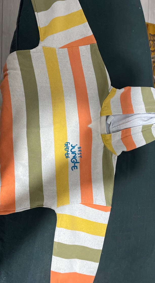 Erkek çocuk için kapüşonlu, uzun kollu, bol kesim çok renkli çizgili sweatshirt. Velcro detaylı, yumuşak ve sıcak tutan kumaştan üretilmiştir.