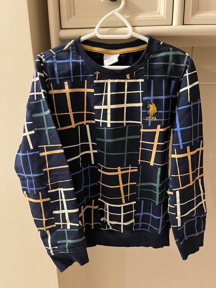 Us polo assn iki kere kullanildi.Uzun kollu, bisiklet yaka, dar kesim erkek çocuk sweatshirtü. Örgü dokusu ve çok renkli kareli baskıya sahip, sentetik kumaştan üretilmiştir.