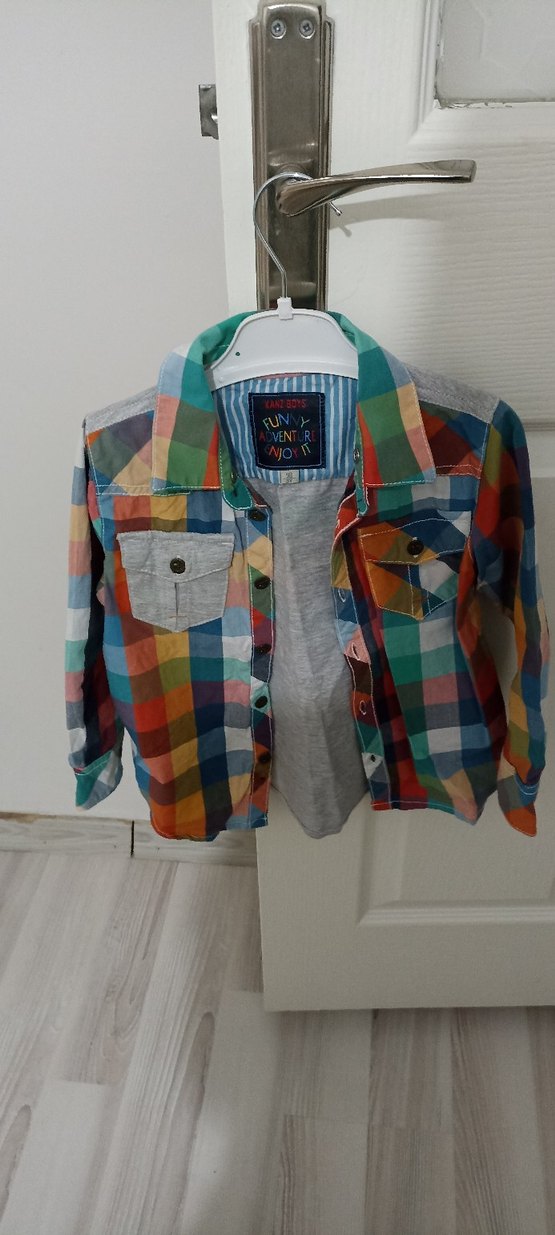Pamuklu kumaştan, bol kesim, düğmeli, çok renkli kareli desenli erkek çocuk uzun kollu gömlek. kanz marka dir temiz urun uygun