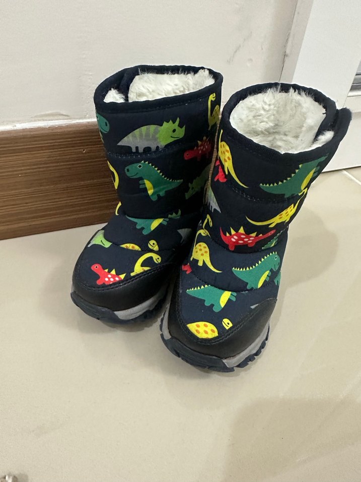 Renkli dinozor desenli, yumuşak iç astarlı ve kauçuk tabanlı erkek çocuk botları. Kolay giyim için cırt cırtlı kapanışa sahiptir.