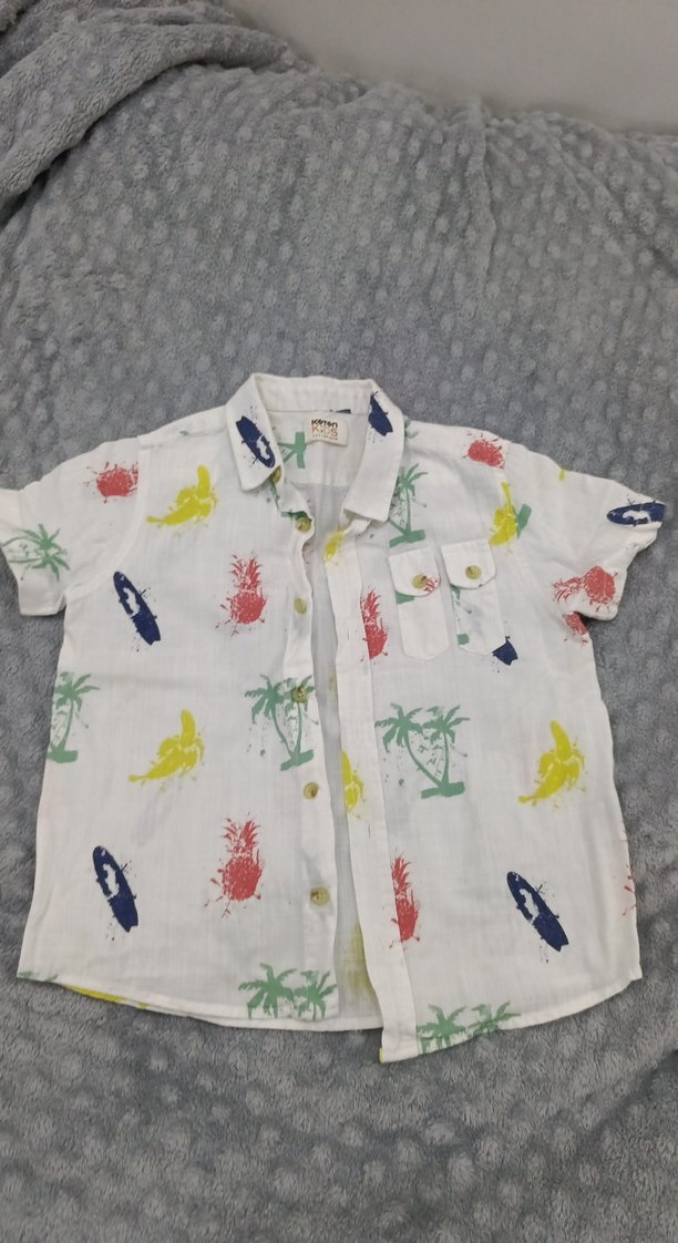 Erkek çocuk için bol kesim, kısa kollu, yakalı gömlek. Çok renkli batik desenli, düğmeli ve cepli, yumuşak pamuk kumaştan yapılmıştır.