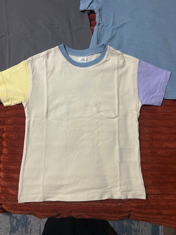 Pamuklu, kısa kollu, çok renkli pastel tonlarda yaka ve kolları farklı renkte olan, salaş kesimli erkek çocuk tişörtü. 3 lü fiyat