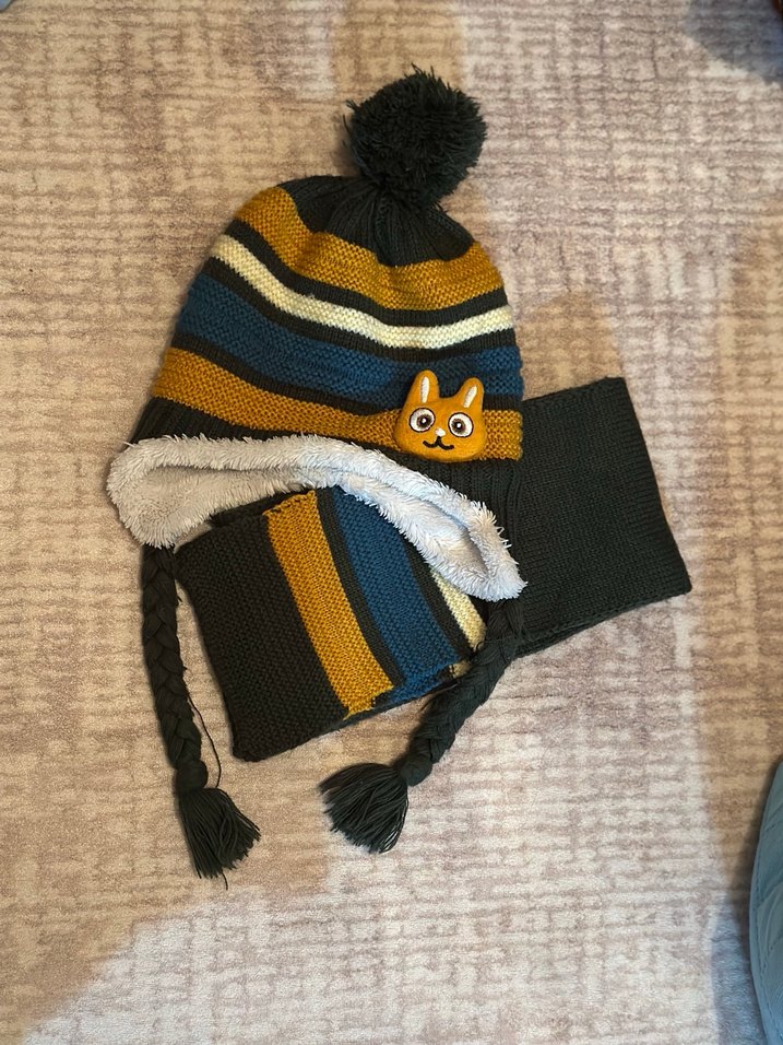 Erkek çocuk için çok renkli nakışlı örgü bere ve atkı seti. Bere kulaklıklı, örgü püsküllü ve ponponlu. İç kısmı yumuşak ve sıcak tutar.