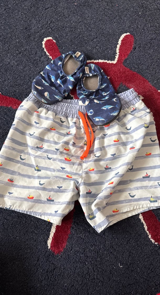 Çok renkli küçük gemi ve balina desenli, rahat kesim erkek çocuk şortu. Yumuşak tekstil malzemeden, elastik bel ve turuncu bağcık detaylı.