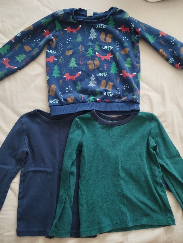 Üçlü erkek çocuk sweatshirt seti. Biri orman ve hayvan desenli, diğerleri düz renk. Rahat, örme kumaş ve bol kesim. Uzun kollu, bisiklet yaka. 2 tanesi hm organik pamuklu biri de yumuşacık lcw. 3-4 yaş bedendir.