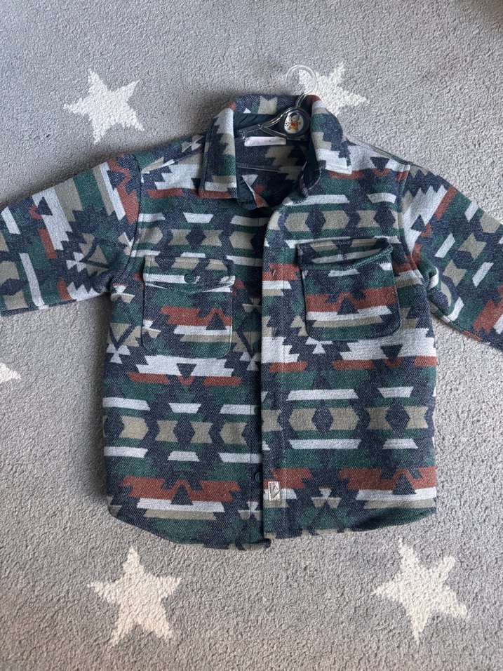 Erkek çocuk için çok renkli, uzun kollu ve düğmeli, gevşek kesim gömlek. Notlu yaka ve sokak tarzı desenlere sahip.