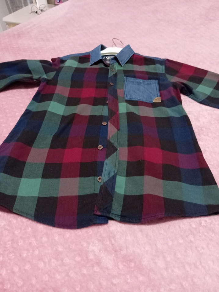 Erkek çocuk için çok renkli, uzun kollu, düğmeli ve bol kesim gömlek. Yakası yakalı ve kot görünümlü cep detayı bulunur. Streetwear tarzında tekstil kumaş.