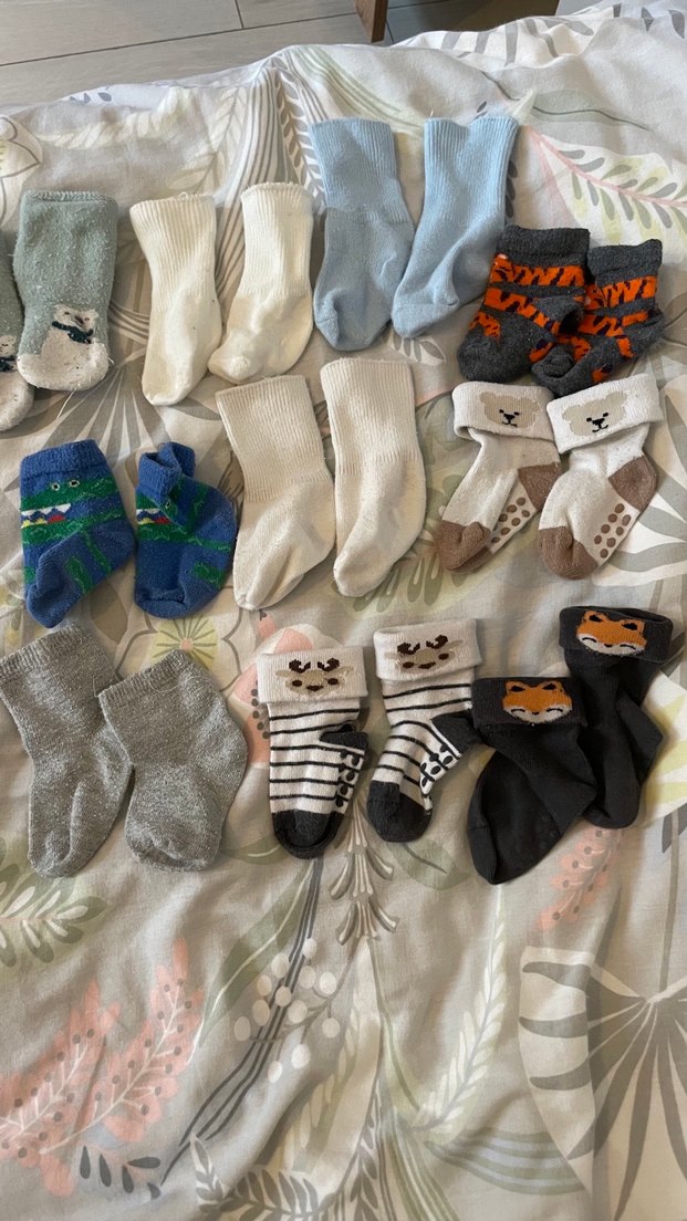 Erkek çocuklar için gri ve renkli tonlarda, düz ve hayvan desenli yumuşak kumaştan çorap seti.