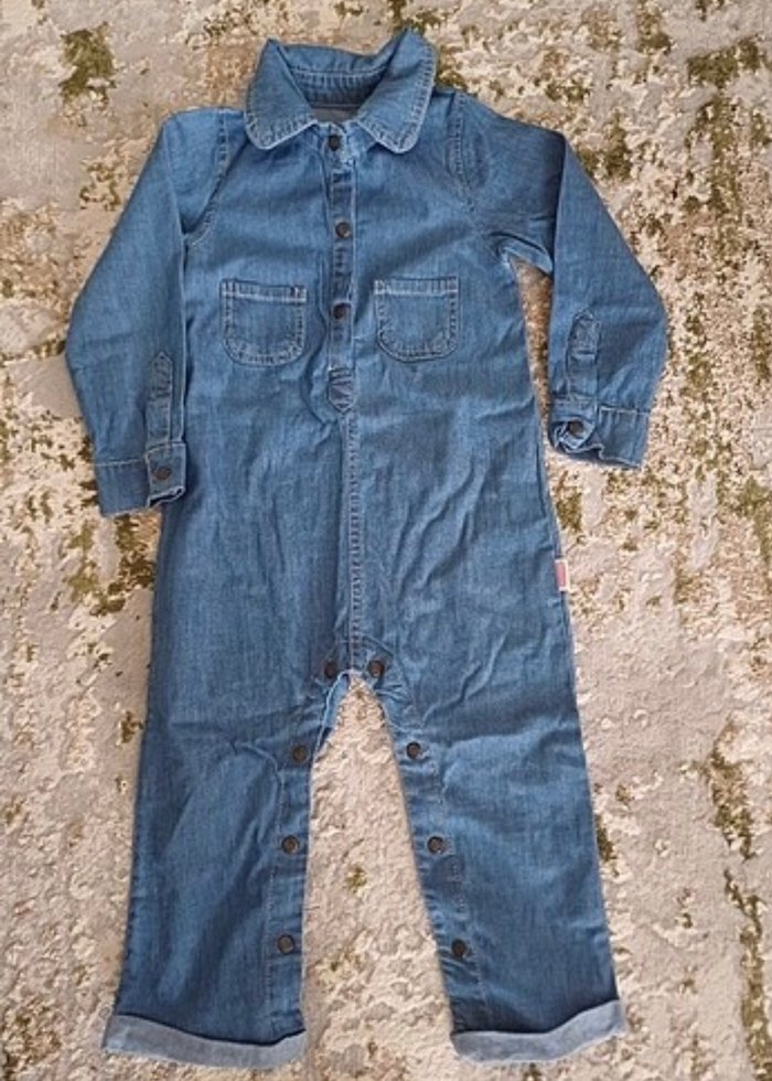 Erkek çocuklar için düğmeli, uzun kollu denim tulum. Regular fit kesim ve sokak stili. Mavi-gri renkte, iki göğüs cebi bulunur.