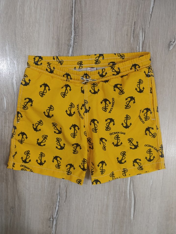Sarı erkek çocuk deniz şortu, renkli çapa desenli Plajda ve günlük sokak stilinde kullanıma uygundur. ️