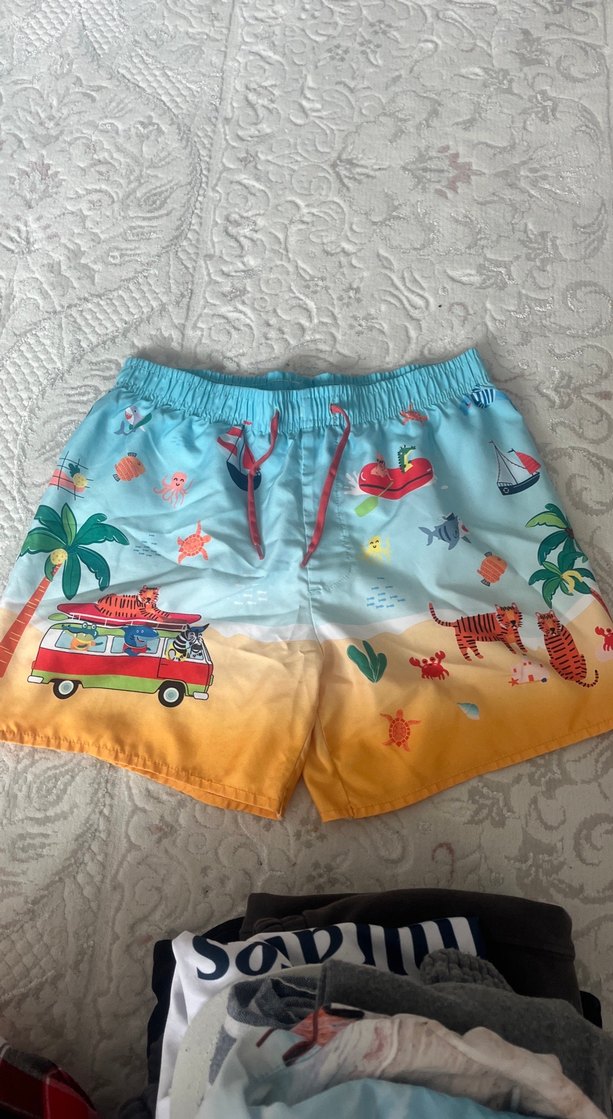 Çok renkli, bağcıklı elastik bel detaylı erkek çocuk deniz şortu. Palmiye ağaçları, hayvanlar ve yaz baskıları bulunur.