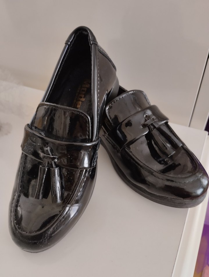 Erkek çocuklar için siyah parlak kauçuk malzemeden yapılmış, püsküllü ve deri ayakkabı.