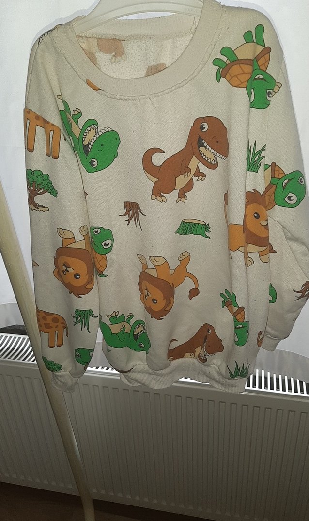 Erkek çocuklar için uzun kollu, bisiklet yaka, yumuşak ve sıcak kumaştan yapılmış, bol kesim kahverengi sweatshirt. Örgü dokulu ve renkli dinozor desenleriyle süslenmiştir. (hafif tüylenme var )