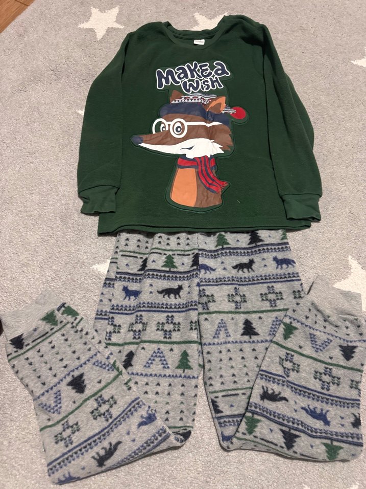 Bol kesim, uzun kollu, yuvarlak yakalı, koyu yeşil renkli polar triko erkek çocuk pijama takımı, baskılı üst ve desenli alt pantolon ile.