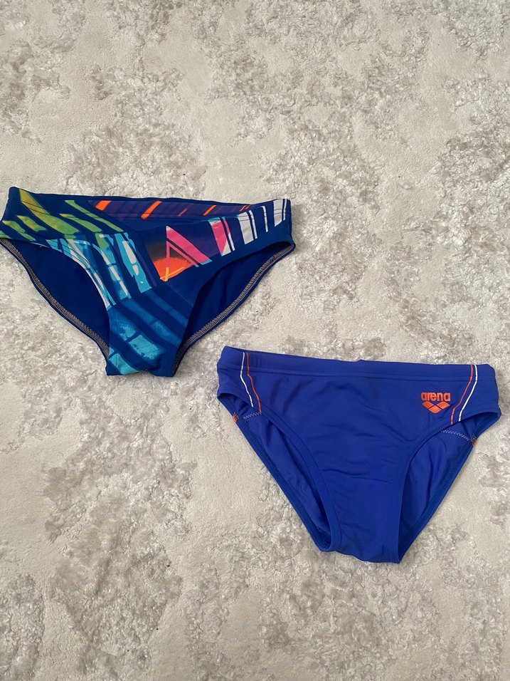 İki adet erkek çocuk mayo, biri renkli tie-dye desenli, diğeri düz mavi ve küçük logo detaylıdır. Her ikisi de yüzme için askılı modeldir. 10-12 yaş sorunsuz toplam fiyat