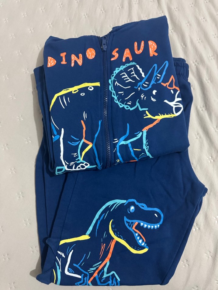Erkek çocuklar için uzun kollu, kapüşonlu, fermuarlı ve renkli dinozor baskılı mavi takım. Rahat ve kullanışlıdır. Çok temiz ve birkaç kez kullanıldı . Normalde sadece kapşonlusu 599 TL alt eşofman 399 TL idi. Takım olarak 550 tl olarak satıştadır