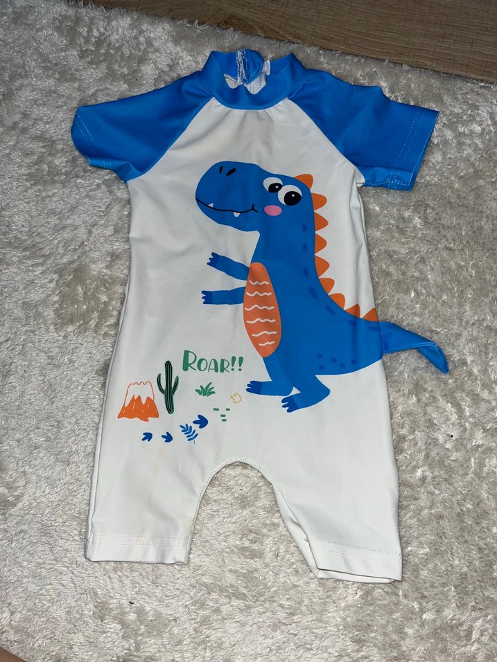 Erkek çocuk kısa kollu mayo, mavi ve beyaz zemin üzerinde renkli dinozor baskısı 9-12 aylıktır