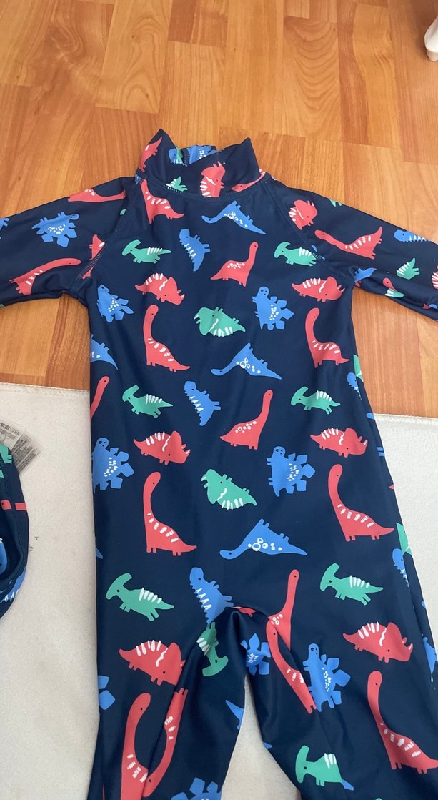 Erkek çocuklar için uzun kollu, koyu zemin üzerine renkli dinozor desenli mayo. Yüksek yakası ile tam koruma sağlar.