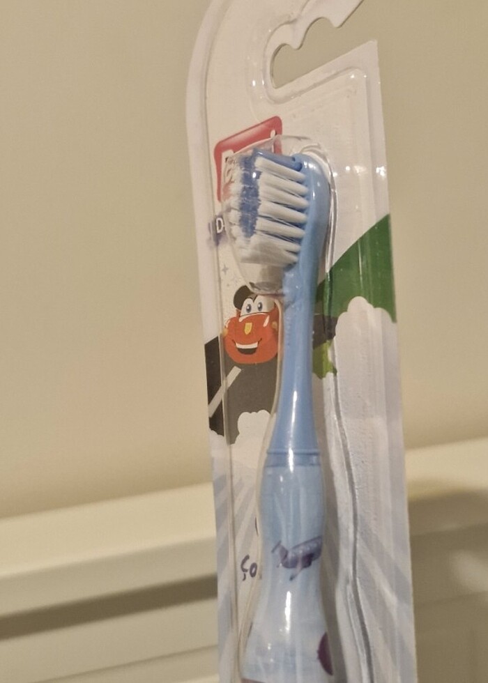Erkek çocuk, cizgifilm objeli, koruma başlıklı dış fırçası. Paketli ürün. Hiç açılmamış