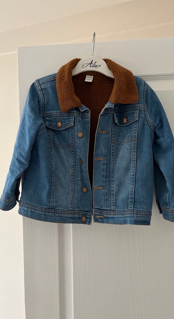 Fitted kesim erkek çocuk denim ceket, düğmeli ve kahverengi yumuşak astarlı yakaya sahip, rahat sokak stili için uygundur. 4/5 yaş