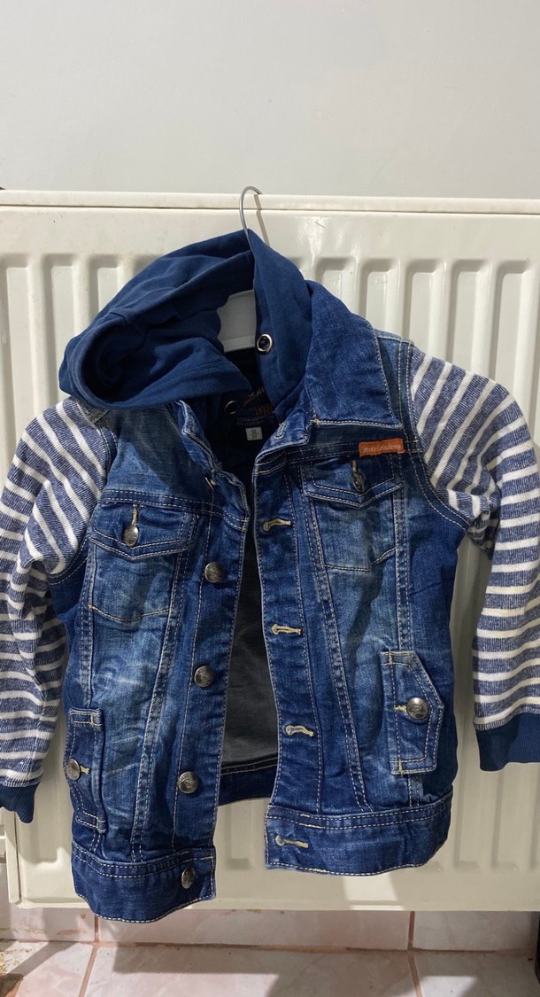 Erkek çocuklar için düğmeli, kapüşonlu ve kesimli denim ceket. Mavi kot kumaş ile gri çizgili kollara sahip, şık ve rahat bir sokak stili parçası.