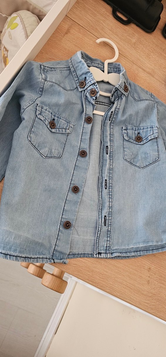 Erkek çocuk için düğmeli, cepli, açık mavi denim gömlek. Uzun kollu, notched lapel yakalı ve bol kesim normcore tarzda.