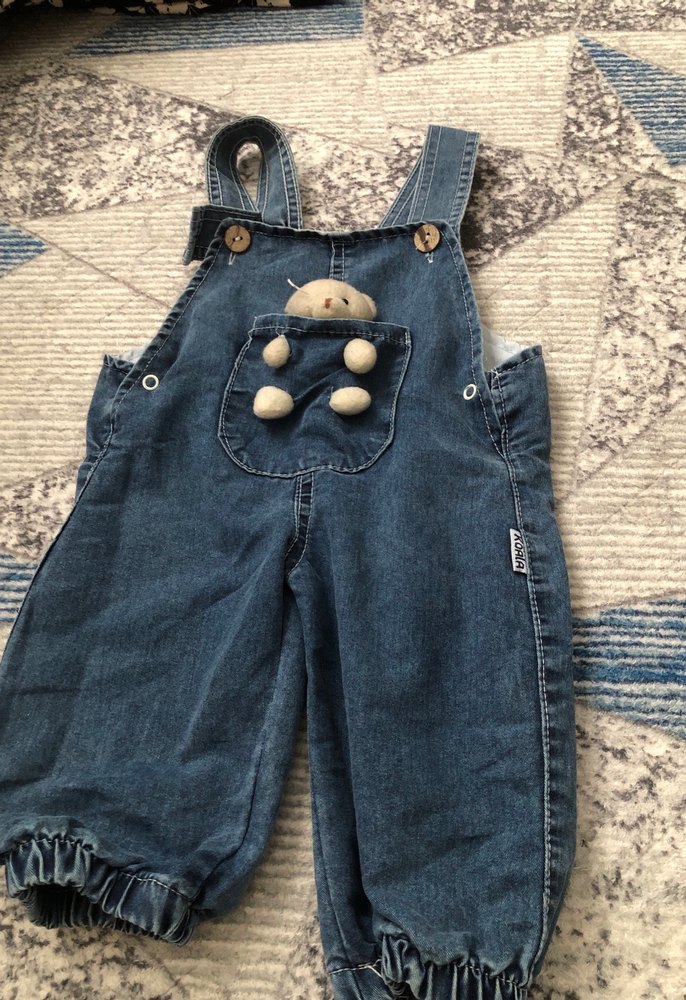 Düğmeli askılı, bol kesim erkek çocuk denim tulumu. Ön cebinde küçük peluş oyuncak bulunur. Rahat ve sade tarzda.