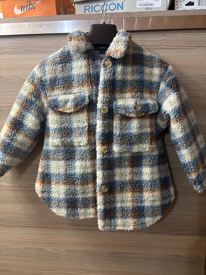 Erkek çocuklar için düğmeli, yaka detaylı, ekose desenli ve rahat kesime sahip yumuşak ve sıcak kumaştan ceket.