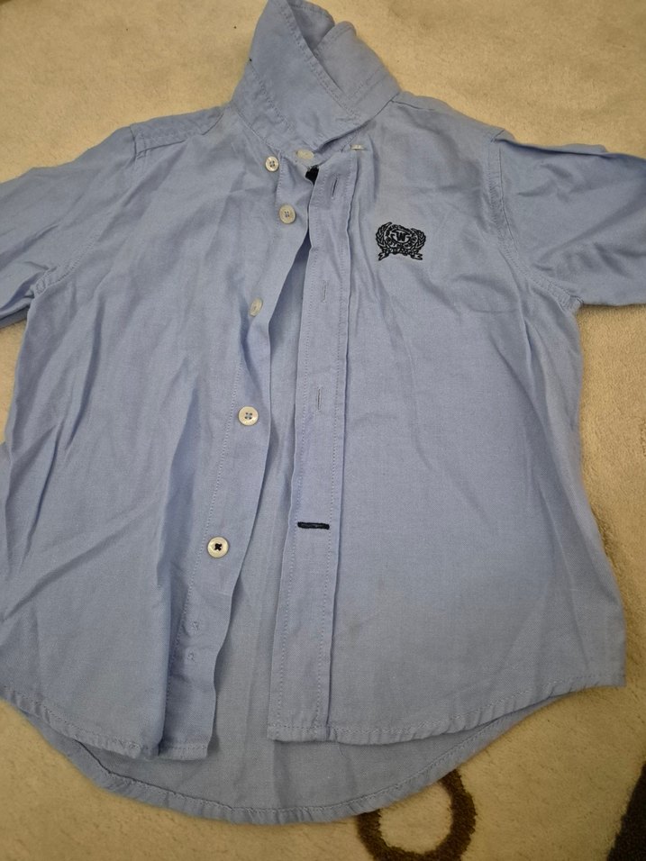 Mavi kumaştan erkek çocuk gömleği, düğmeli ve uzun kolludur. Salaş kesimi ve sade deseniyle günlük sokak tarzına uygundur.