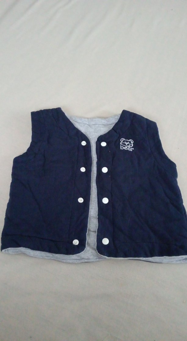 Düğmeli, iki taeaflı giyilen erkek çocuk yeleği, bol kesim ve göğüste ayı logosu. Yumuşak ve sıcak kumaştan, gri lacivert renkte. #yelek #mont #erkekyelek #