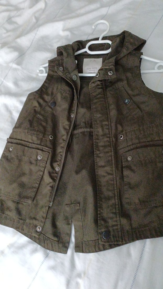 Kahverengi ve gri tonlarında, keten kumaştan yapılmış, düğmeli, kolsuz ve notched lapel yakalı erkek çocuk yeleği. Rahat ve bol kesimdir.