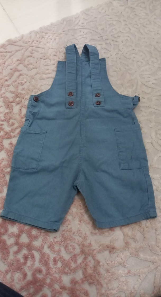 Gri-mavi kot kumaştan, düğmeli ve cepli, bol kesim, kolsuz erkek çocuk şort tulumu.