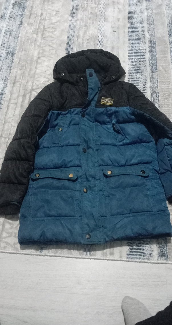 Erkek çocuklar için düğmeli, bol kesim, koyu mavi-siyah renklerde streetwear tarzında, yumuşak ve sıcak kumaştan mont.