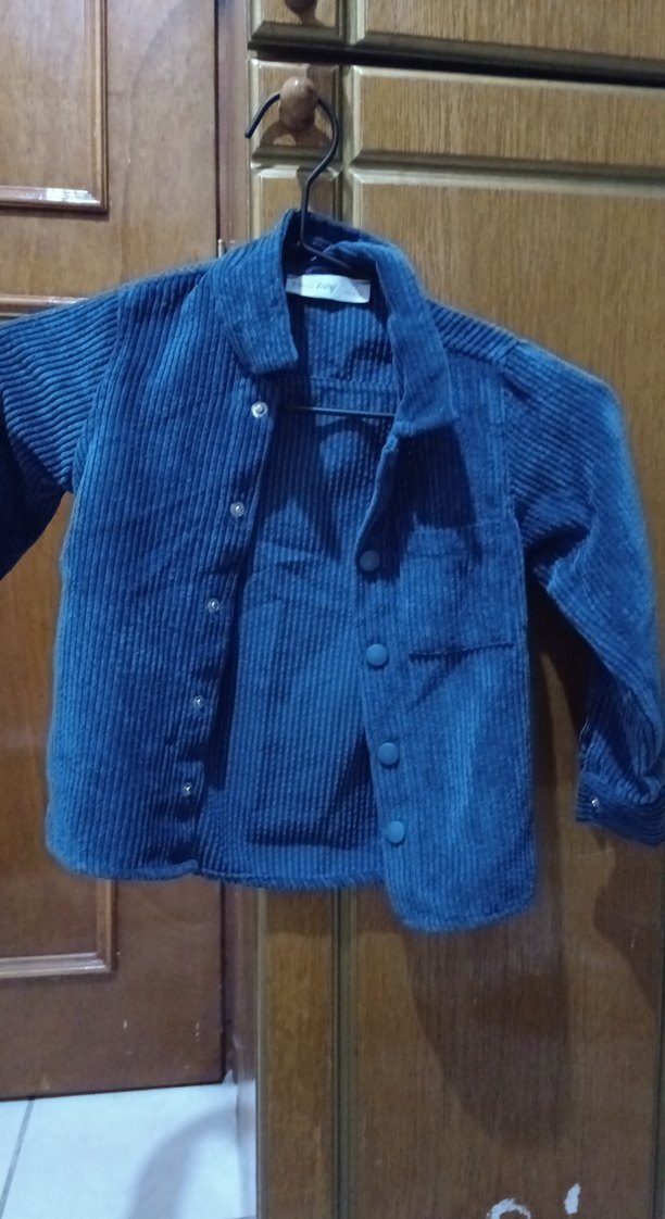 Erkek çocuk için düğmeli, lacivert kot kumaştan yapılmış, klasik yakalı ve regular fit kesime sahip sade bir ceket.