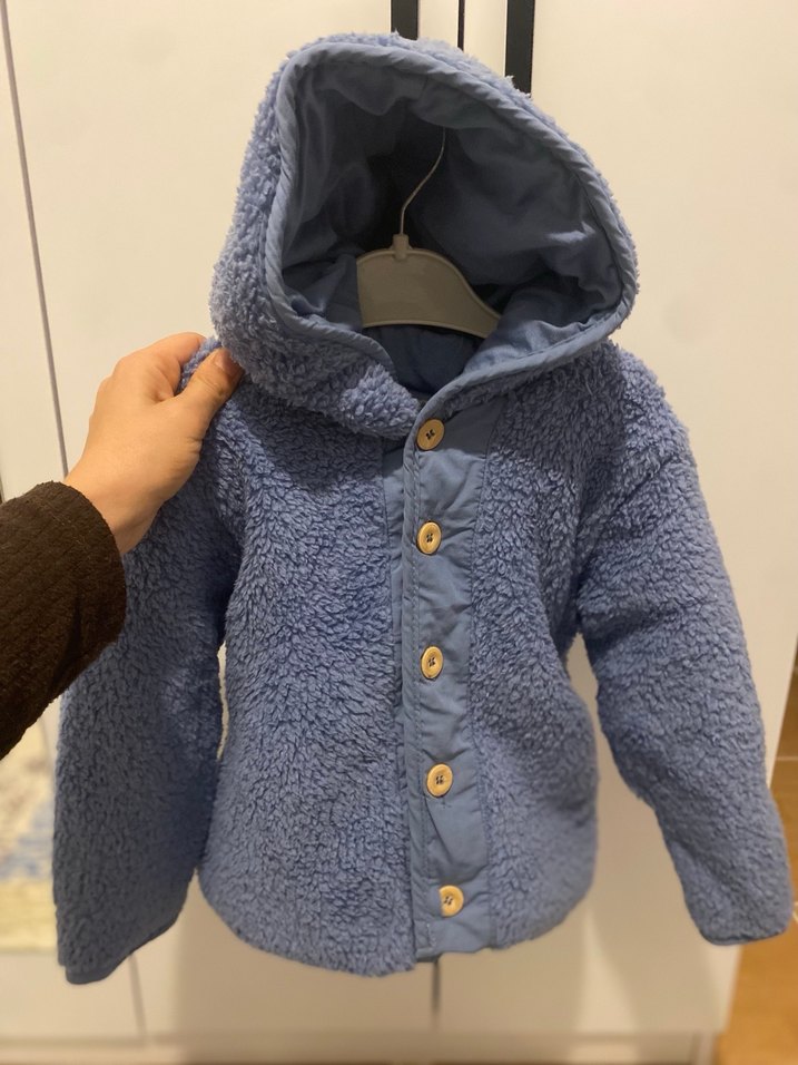 Erkek çocuklar için düğmeli, yumuşak ve sıcak peluş kumaştan yapılmış, bol kesim mavi mont. Düz renk ve çentikli yakaya sahip, sokak stili için uygun. Sıfır ürün hediye geldi ama bize çok büyük