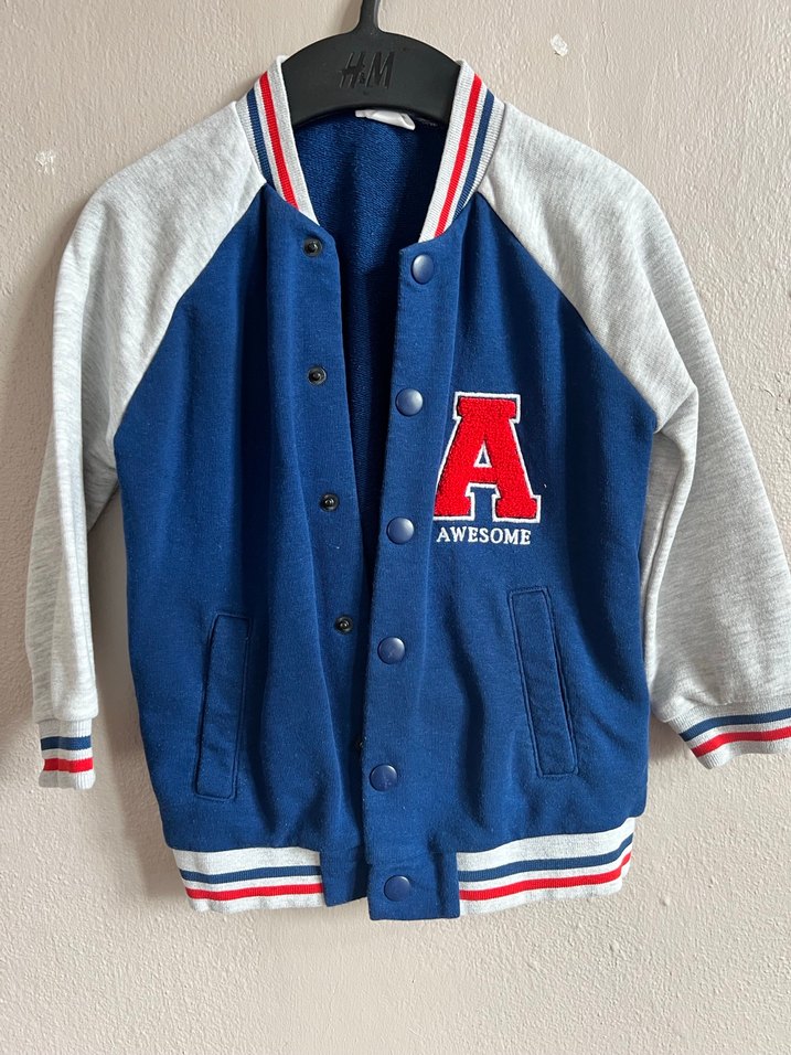 Lcw 3-4 yaş. Düğmeli, gri kollu ve mavi renkli erkek çocuk ceketi. Yumuşak kumaştan, bol kesim ve göğsünde 'A AWESOME' baskısı vardır.