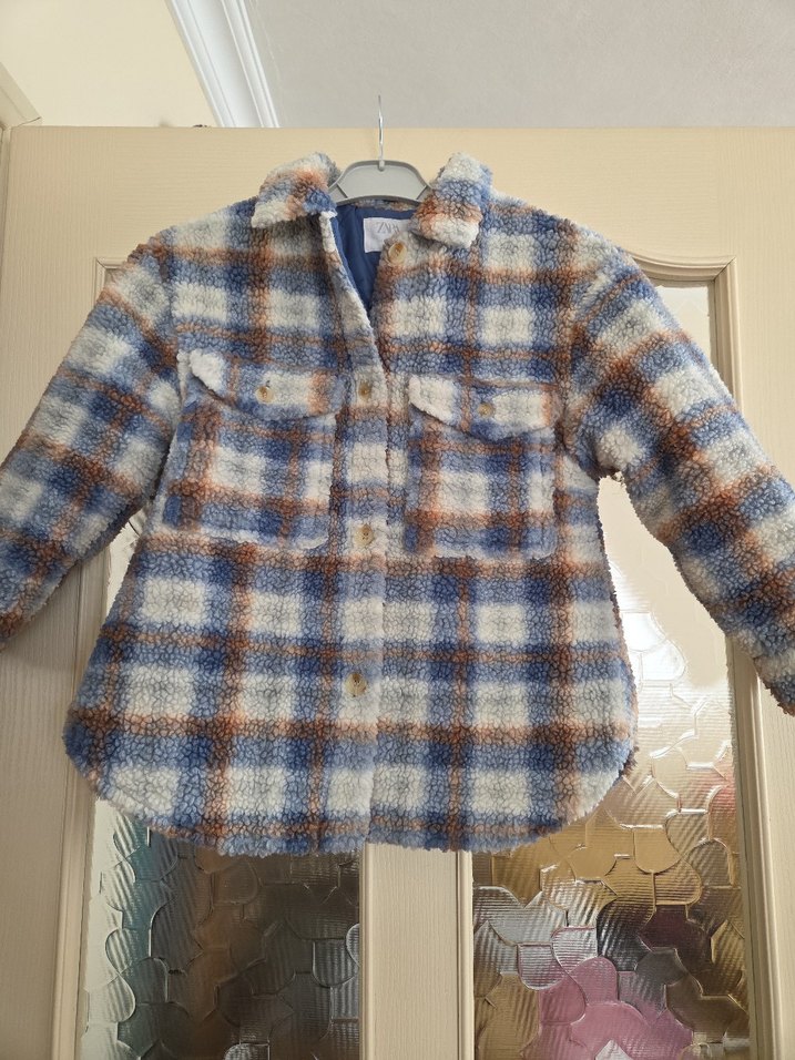 Erkek çocuk için düğmeli, oversize kesim ve notalı yaka detaylı peluş mont. Gri ve kahverengi tonlarında kareli desen içerir, rahat sokak stili için uygundur.