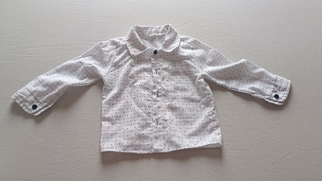 Erkek çocuklar için düğmeli, yakalı ve bol kesim uzun kollu gömlek. Yumuşak pamuklu kumaştan, beyaz zemin üzerine gri desenlidir.