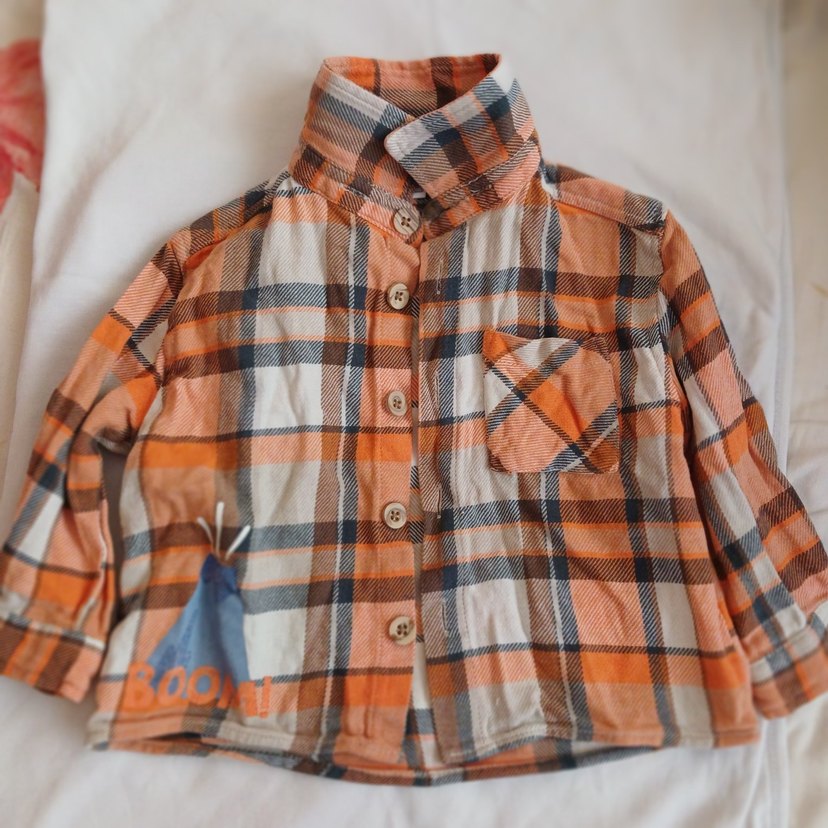 Pamuklu, düğmeli ve uzun kollu erkek çocuk gömleği. Kahverengi ve turuncu kareli deseniyle rahat kesimdir.