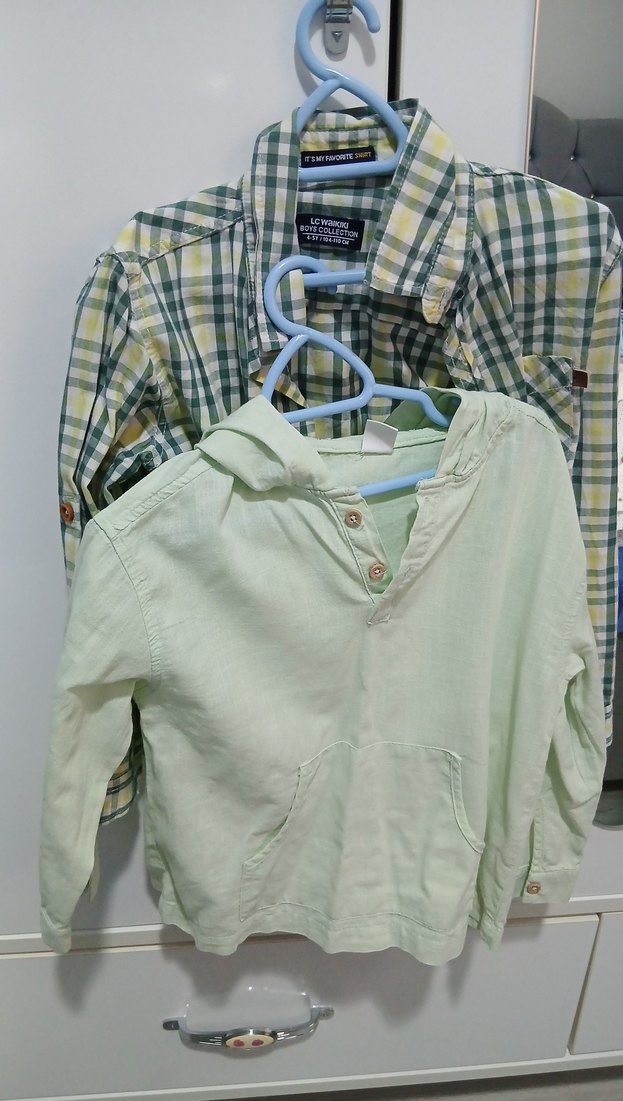Erkek çocuklar için düğmeli, uzun kollu, bol kesim pamuklu gömlek. Hafif yeşil renkte, yakalı ve sokak stili için uygun. tane fiyatıdır