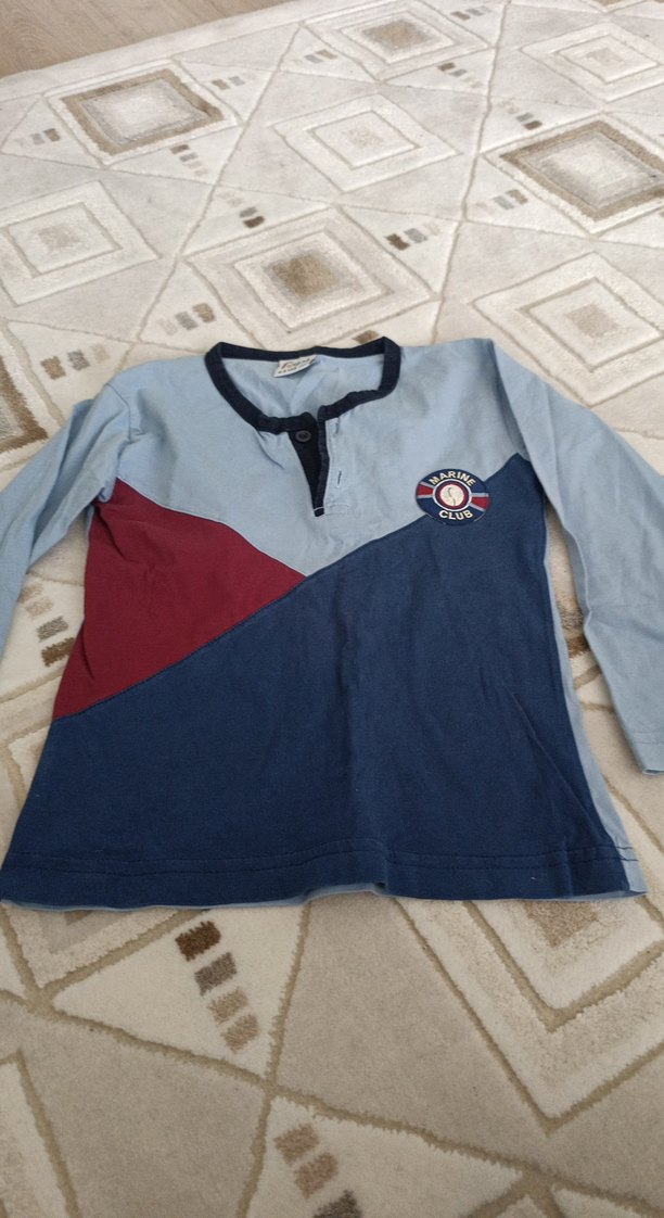 Erkek çocuk için düğmeli, uzun kollu, bisiklet yaka sweatshirt. Pamuklu, bol kesim, mavi, gri ve bordo renk bloklu baskılı tasarım. Street wear tarzında.